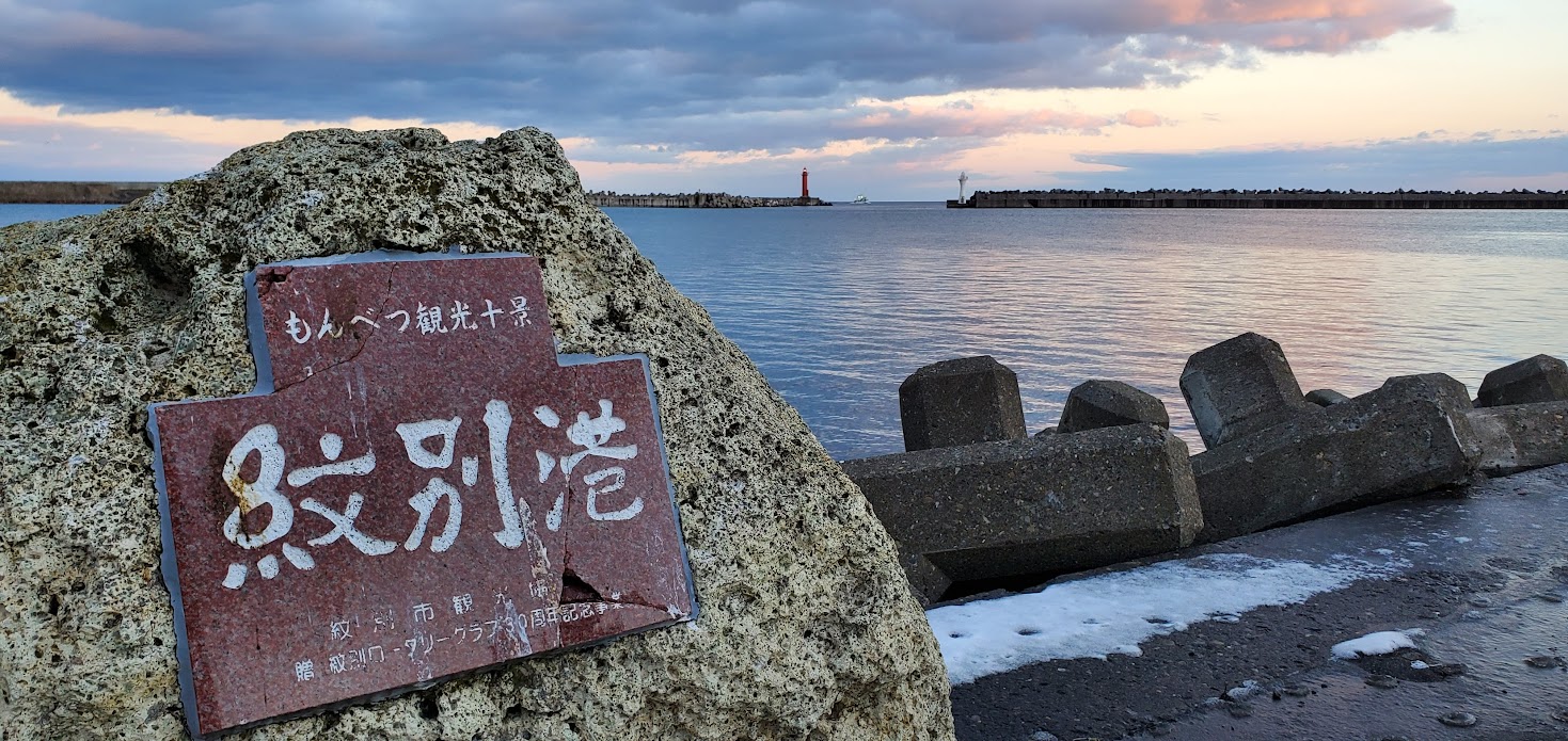 北には弁天岬の岩礁、背後には紋別山(大山)が広がり、古くから漁業の拠点として栄えてきました。